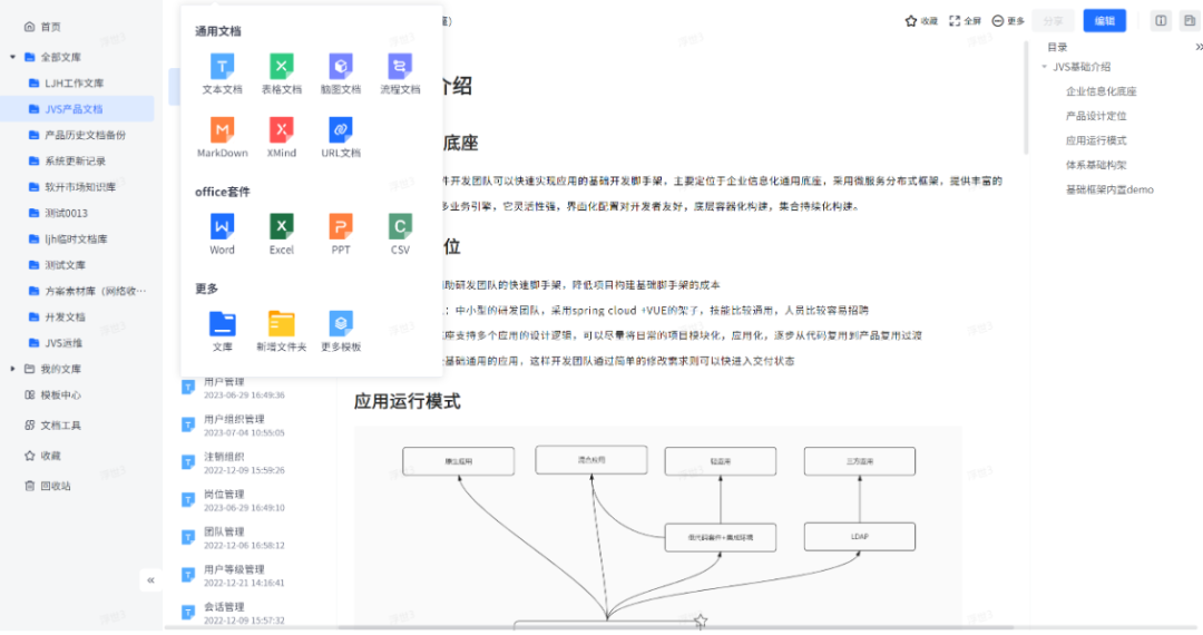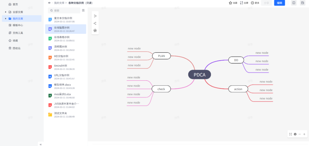 核心功能集成多种文件编辑器- 富文本编辑器、在线表格、在线脑图、在线流程图等,编辑器将会持续扩展