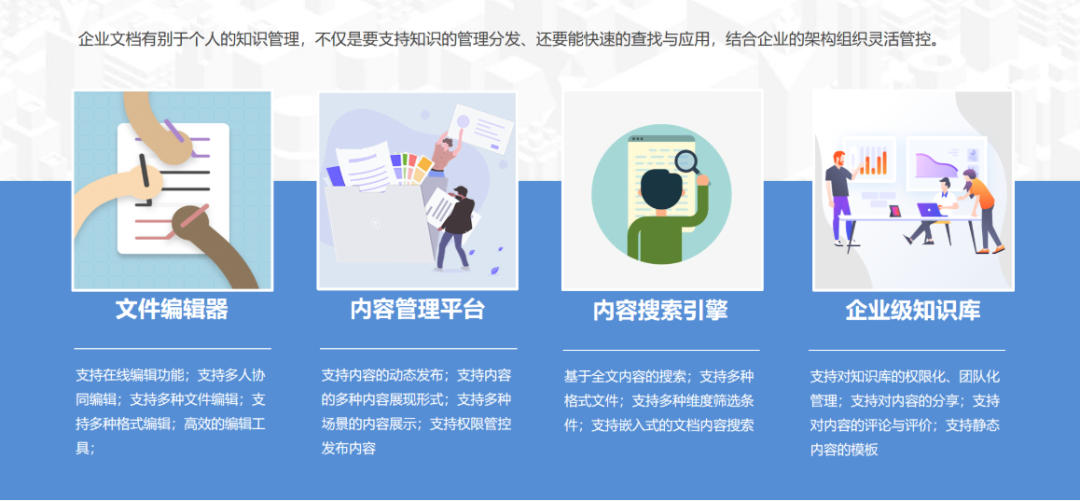 解决的问题- 数据资产化的问题 :没有合适的文件管理工具,很难对员工无形知识转化为企业的有形资产,导致培训、学习、展示上浪费了大量的资源,而且效果还不尽人意。