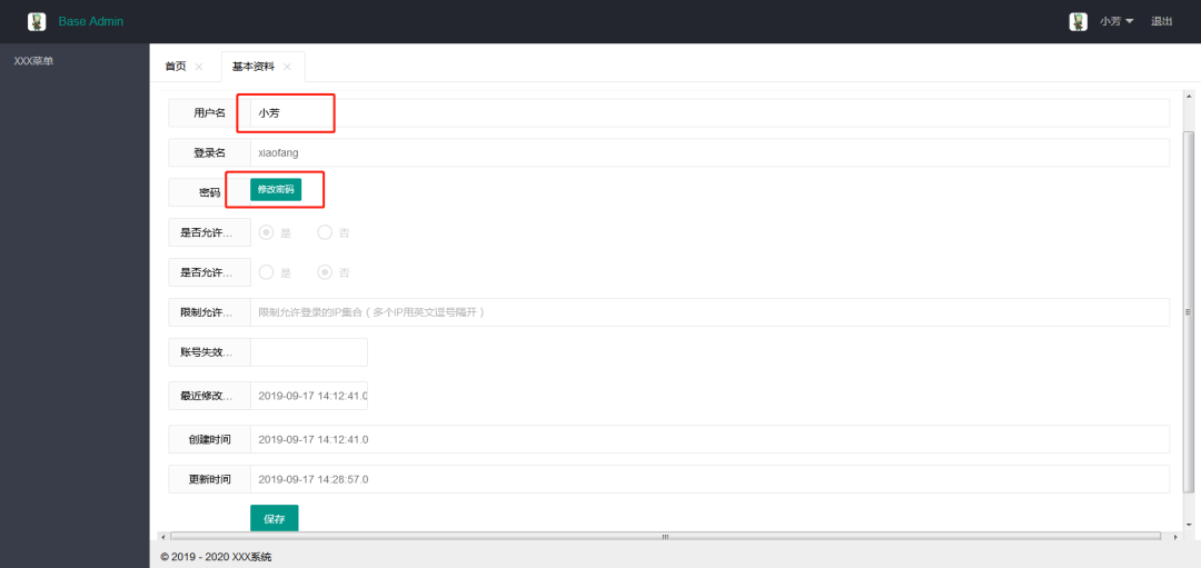 登录用户信息基本信息登录用户只能修改部分信息,例如名称、修改密码修改密码密码使用的是MD5加密并转换为16进制字符串存储,用户除了能主动修改密码外,还能叫管理员重置密码。