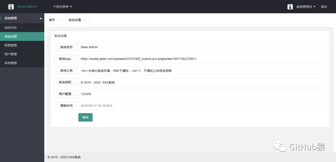 系统设置新增部分功能,详见文末“补充更新”搜索公众号GitHub猿回复“打飞机”,送你一份惊喜礼包。菜单管理菜单管理是一棵layui的Tree
