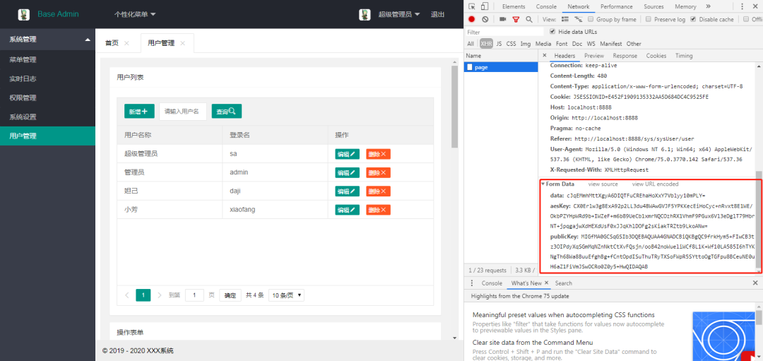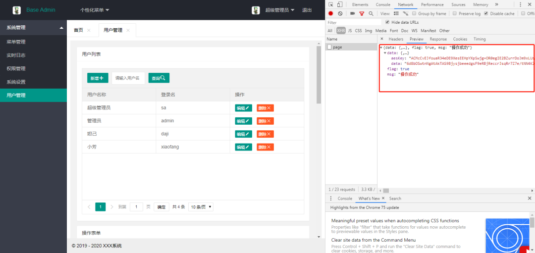 关键点讲解1、定制url访问权限,动态权限读取,需要自定义配置认证数据源、认证管理器、拦截器,详情步骤请参考:https://www.jianshu.com/p/0a06496e75ea;2、API加密中,由于登录校验是Spring Security做的,因此我们要在UsernamePasswordAuthenticationFilter获取账号、密码之前完成解密操作,正好我们的校验验证码操作就是在它之前,同时要做响应数据的加密操作,所以登录部分的API加密光按照我们之前的博客来还是不够的,需要在CaptchaFilterConfig进行解密操作,解密后new一个自定义RequestWrapper设置Parameter,并将这个新对象传到doFilter交由下一步处理。3、还是API加密问题,我们是在程序启动的时候生成后端RSA秘钥对,正常来说我们在访问登录页面进行登录的时候前端获取一下就可以了,但在开发环境中,我们通常开启热部署功能,改完代码程序可能会自动重启,但登录用户信息仍然保持在本地线程,系统依旧处于登录状态没有跳转到登录页面,导致后端公钥已经改变,但前端依旧用的是旧的后端公钥,所有导致加解密失败;解决:在访问index首页时也获取一下后端公钥,这样在开发的时候idea热部署后刷新页面就可以了(已提交最新代码,解决热部署后刷新页面还是API加解密失败问题;现在热部署后刷新页面即可)4、好多人都不知道,项目有工具类CodeDOM.java可以生成一套单表的完整增删改查后台代码。