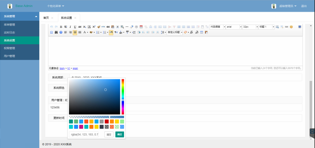 4、系统设置新增系统颜色,头部、左侧菜单的颜色可按心情切换(SQL文件已同步更新)