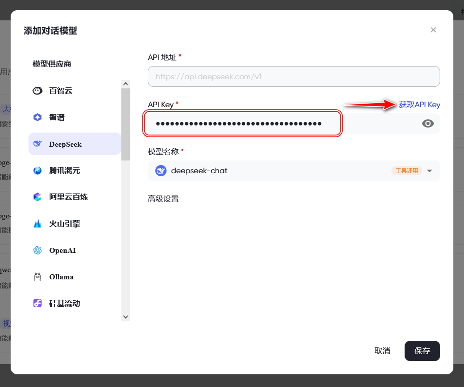 >>配置AI模型>>登录后的第一步就是配置好AI对话模型,也就是填入APIkey(可以点击右侧的“获取>API>Key”来获取>),然后选择模型。