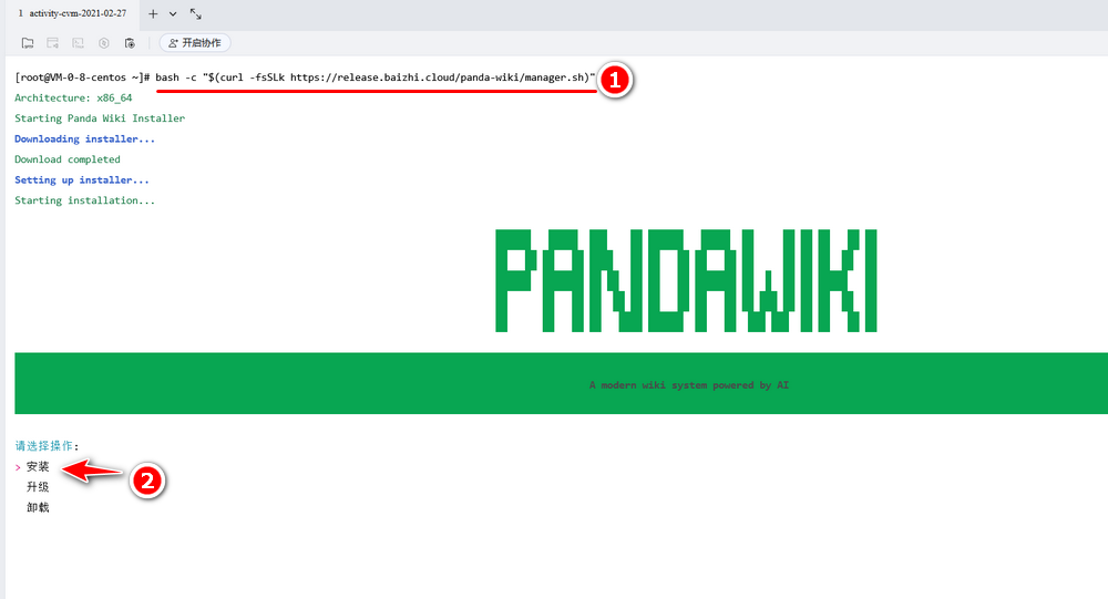 >>过程中会提示选择安装选项,直接选“>安装>”,默认目录为 >/data/pandawiki>。