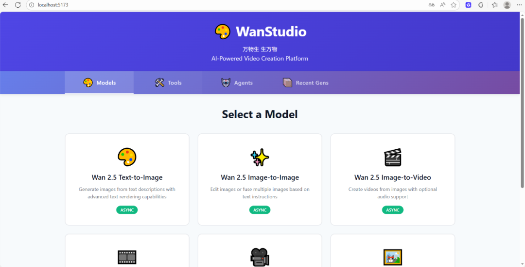 如果需要制作文生图,图生视频的动态漫,可以考虑使用封装好的前端,可以快速体验使用万相的一系列模型,提高生产效率