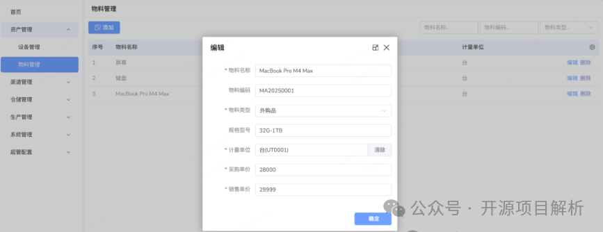 功能:全面管理企业的生产设备、工具、原材料等资产,包括采购、入库、出库、维修、报废等全生命周期管理。